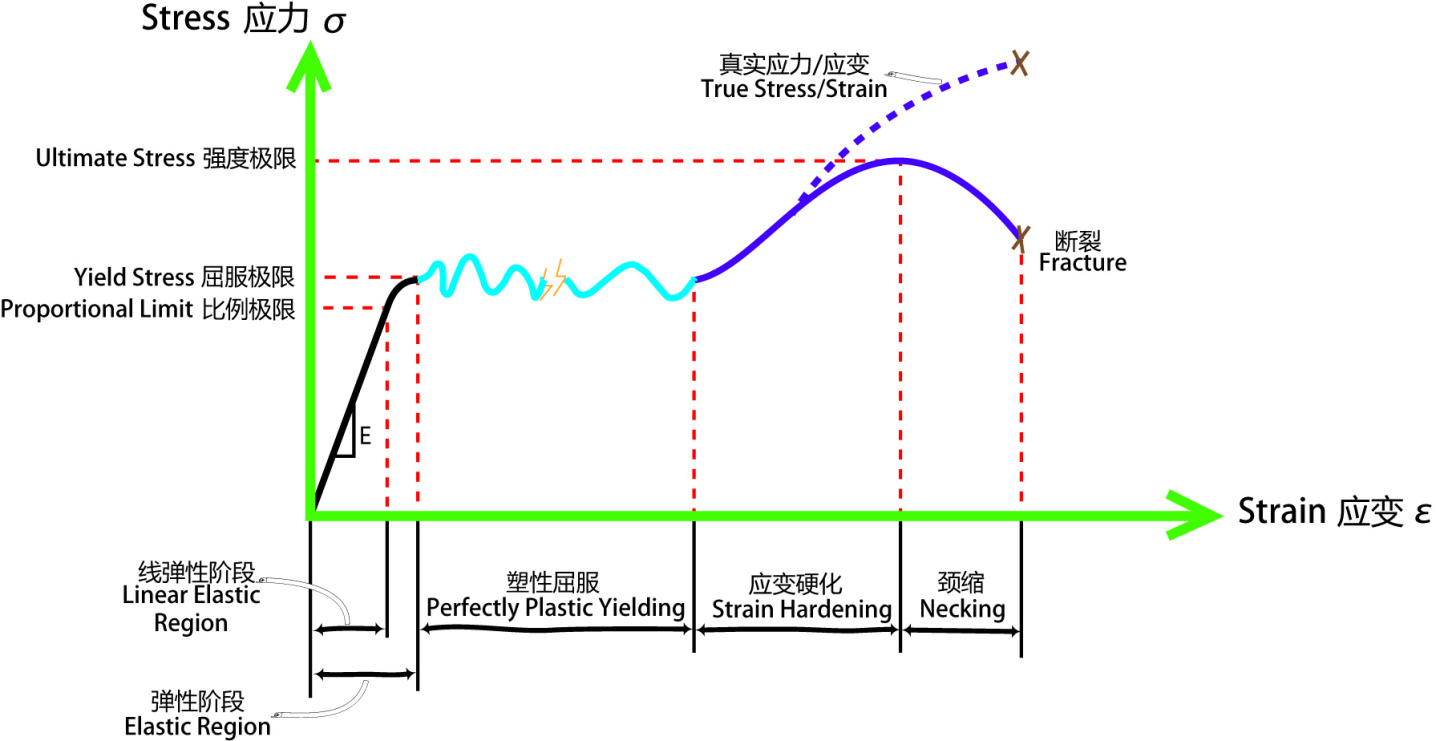 其中,E 称为弹性模量或杨氏模量。弹性模量是表征材料硬度的力学特征量。在弹性线性阶段,胡克定律(1676)为: